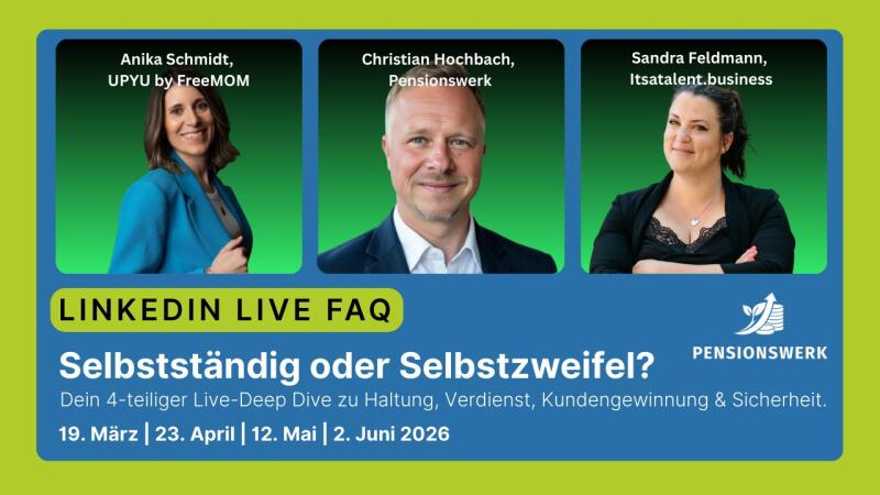 Mit der LinkedIn Live-Serie „Selbstständig oder Selbstzweifel?“ lädt unser Partner Pensionswerk zu einem offenen Austausch über die Realität der Selbstständigkeit ein.